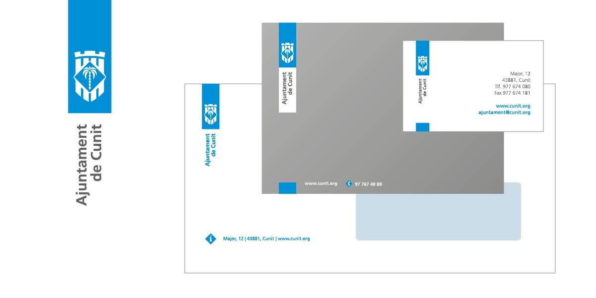 L'Ajuntament de Cunit ens va encarregar la renovació de la identitat visual de l'Ajuntament, que comprenia principalment el disseny d'un nou emblema de l'Ajuntament i el seu desenvolupament en tots els elements de comunicació que utilitzen les diferents àrees i departaments del consistori.